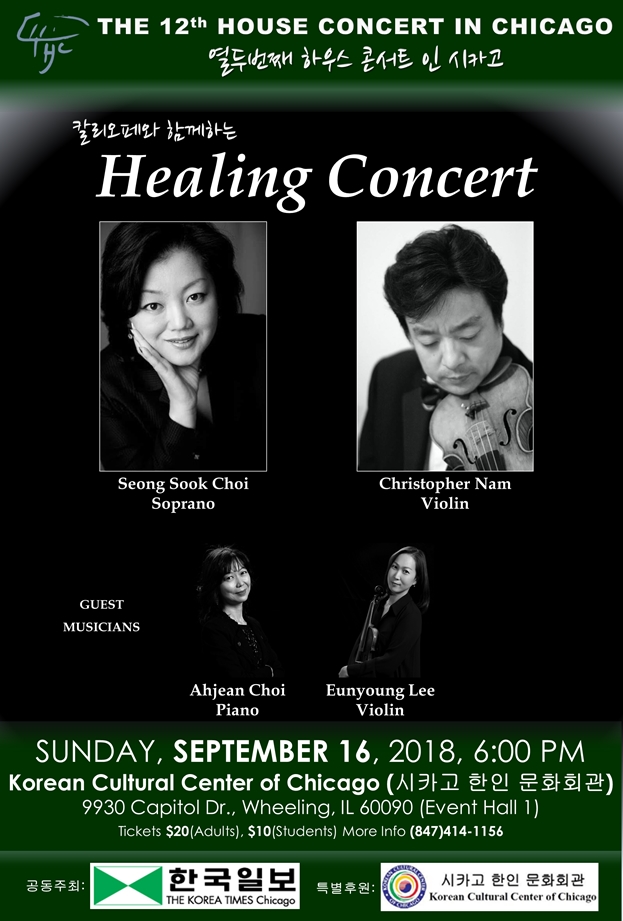 이번 하우스콘서트에서는 2009년부터 뉴욕 뉴저지지역에서 활발히 활동하며 클래식과 오페라의 대중화에 기여하고 있는 칼리오페 소사이어티의 단장 소프라노 최성숙과 바이올리니스트 남철우 부부가 초청돼 넬라판타지아, 가고파, 밀양아리랑 등 대중적인 클래식, 한국가곡, 뮤지컬곡등을 시카고 한인 동포들에게 선보일 예정이다.