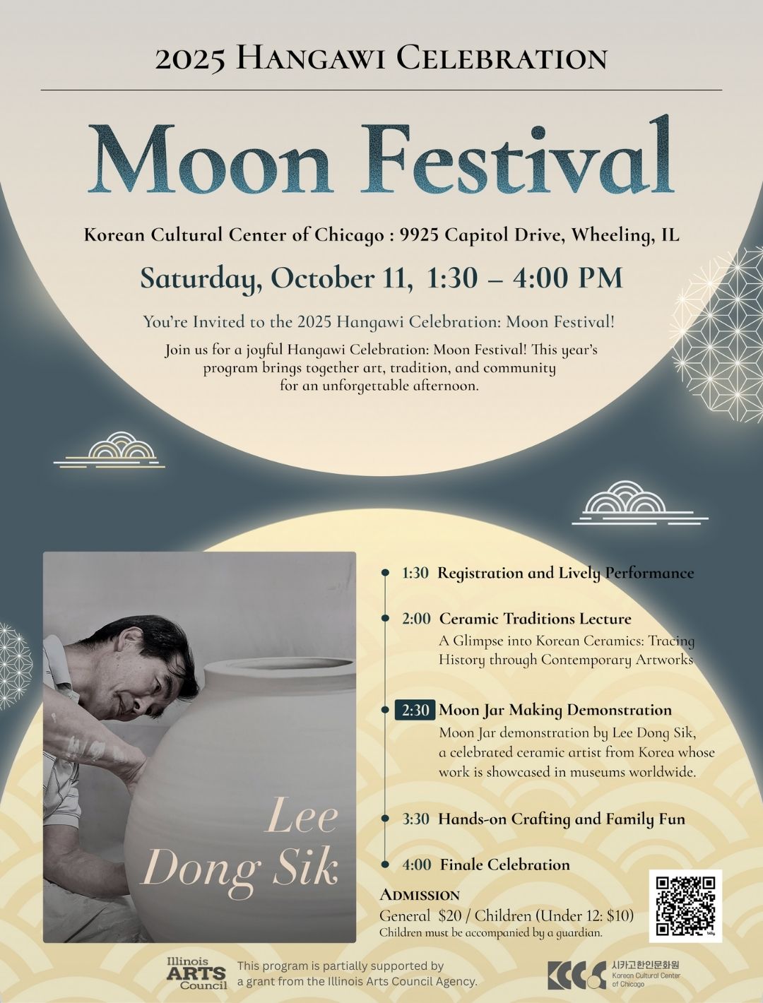 시카고한인문화원은 한국의 대명절 추석을 맞이하여 오는 10월 11일, 토요일에 여러분과 함께 풍성한 가을의 즐거움을 나누고자 합니다. 행사는 전통 길놀이 공연으로 힘차게 막을 올린 후, 한국의 대표적인 도예가 이동식 작가의 달항아리 제작 시연이 열립니다. 전 세계 주요 박물관에 작품이 소장될 만큼 명성이 높은 이동식 작가의 섬세한 장인정신을 직접 경험할 수 있는 아주 특별한 기회입니다. 또한 덴버 미술관의 아시아 미술 큐레이터 김현정의 강연을 통해 한국 전통 도자기에 담긴 깊은 이야기를 만나실 수 있습니다.