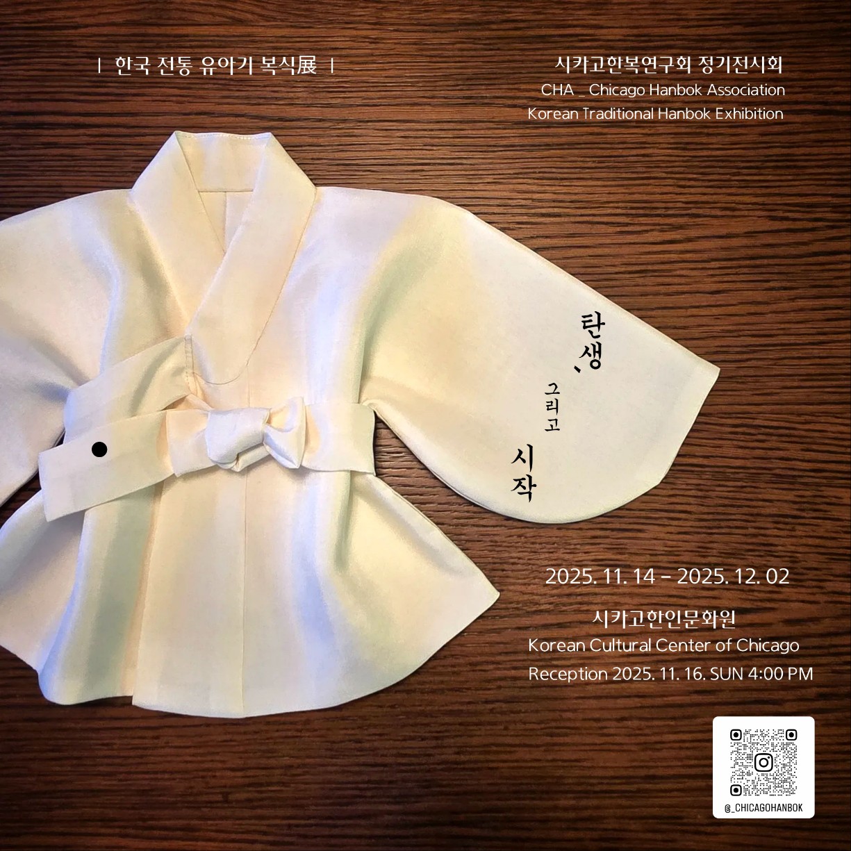 Chicago Hanbok Association (CHA) Exhibition 시카고한복연구회 정기전시회 한국전통 유아기 복식전 Exhibition: November 14-December 2, 2025 Opening Reception: Sunday, November 6, at 4 PM at KCCoC Gallery 9925 Capitol Dr., Wheeling, IL. + Add to Google Calendar + iCal / Outlook export Date Nov 14 2025 - Dec 02 2025 Time 9:00 am - 5:00 pm Location KCCoC Gallery Category Event Gallery