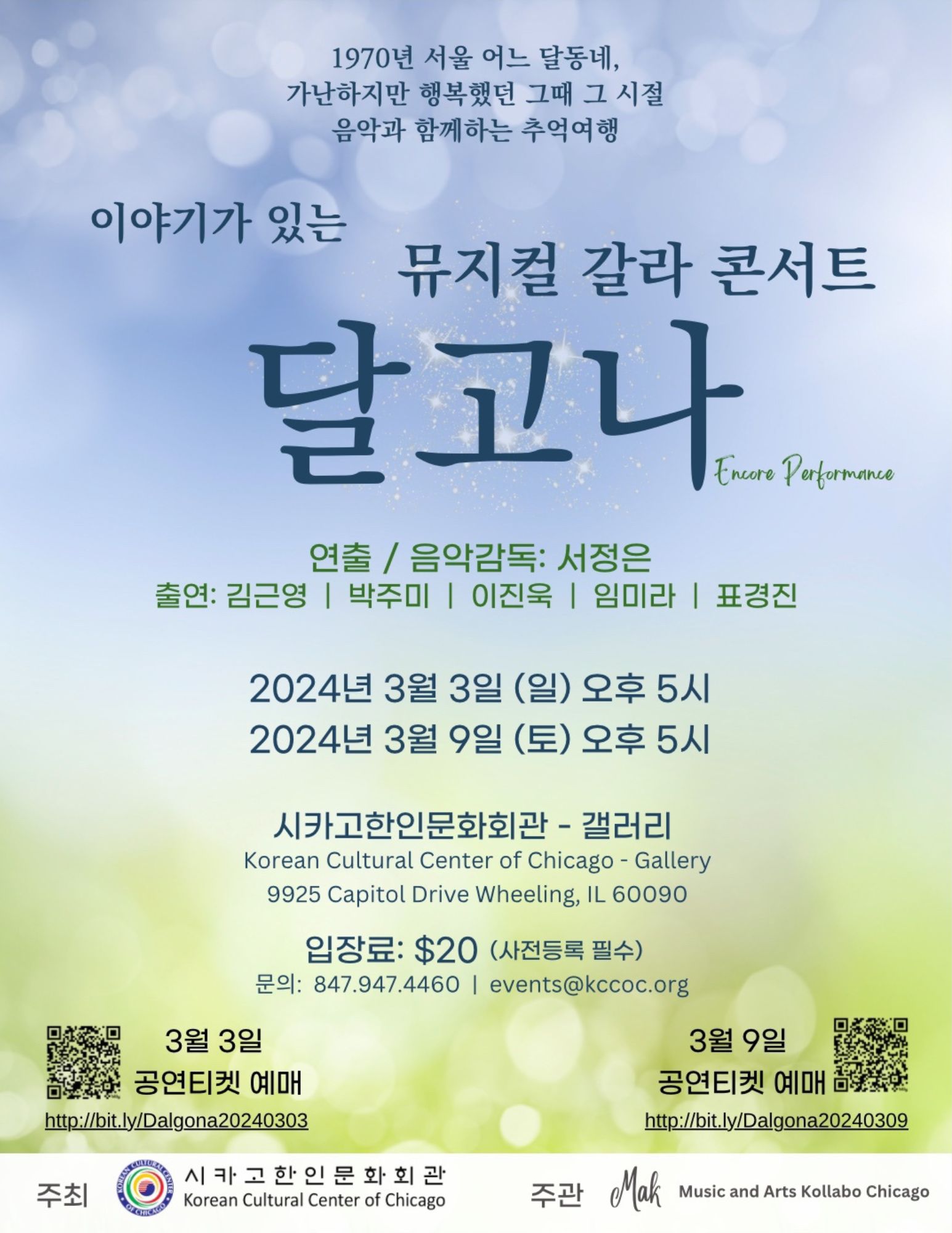 1970, one of many Dal-dongnaes* in Seoul, when times were tough but happy, a time to reminisce about the past with music from that era… This Gala concert is a performance of Korean pop music as a newly presented musical number. We invite you to ‘Dalgona’, presented by Music and Arts Kollabo Chicago ‘Mak’ and hosted by Korean Cultural Center of Chicago.