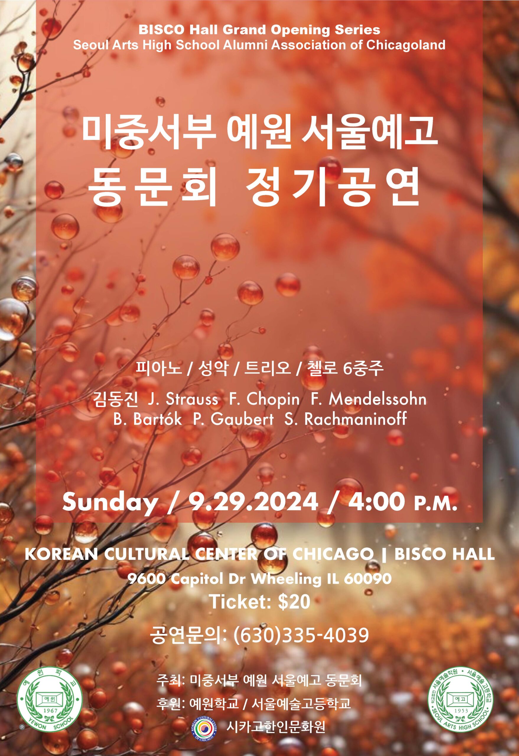 Seoul Arts High School Alumni Association of Chicagoland Regular Concert 미중서부 예원 서울예고 동문회 정기공연 Sunday, Sep. 29, 2024 at 4pm at BISCO Hall 9600 Capitol Dr., Wheeling, IL. Tickets: $20 Inquiry: (630) 335-4039 + Add to Google Calendar + iCal / Outlook export Date Sep 29 2024 Expired! Time 4:00 pm - 6:00 pm Location BISCO Hall 9600 Capitol Drive Wheeling, IL 60090 Category Event