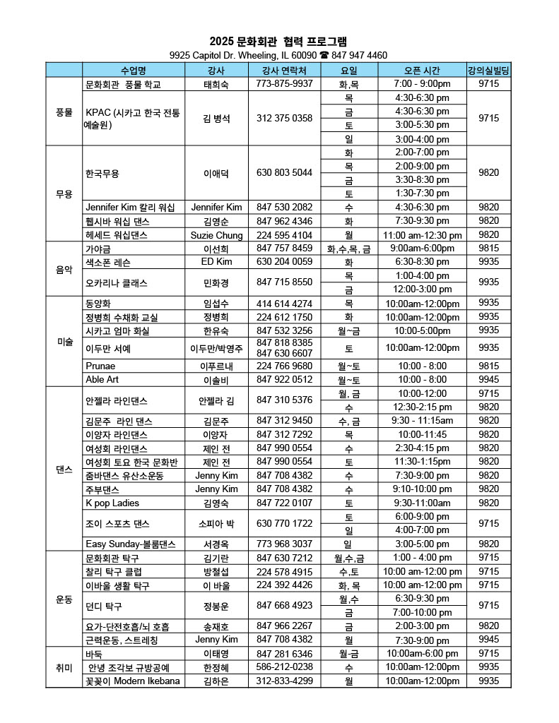 시카고한인문화원은 세대의 한민족 정체성을 고취시키며, 미국 시민으로서 새로운 문화 전달의 목적으로 설립되였습니다. 문화원은 이 필요를 충족시키기 위한 다양한 프로그램들을 제공합니다. 정규프로그램과 협력프로그램으로 구성되며 정규프로그램은 문화원의 교육부가 직접 제공하는 프로그램이고 협력프로그램은 문화원을 이용하시는 선생님들께서 문화원의 지도하에 운영하는 프로그램입니다.